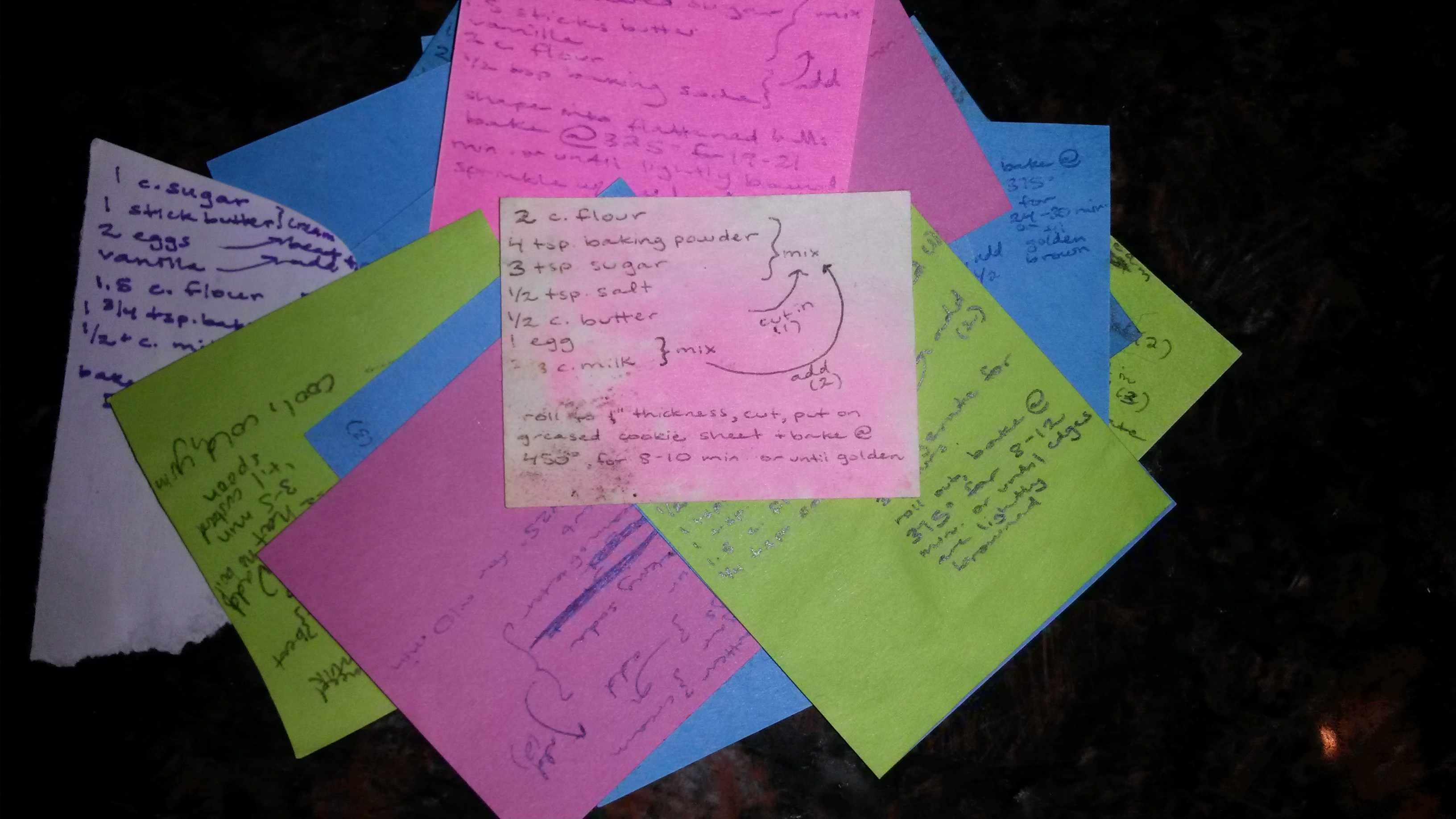And so I remained loyal to this recipe. Occasionally I tried others–biscuits made with melted butter, with cream, with buttermilk–but nothing was quite so buttery and fluffy as this recipe. I’d return to that tiny pink Post-It every time… as evidenced by the way it’s aged over the years in comparison to my other recipe Post-Its.