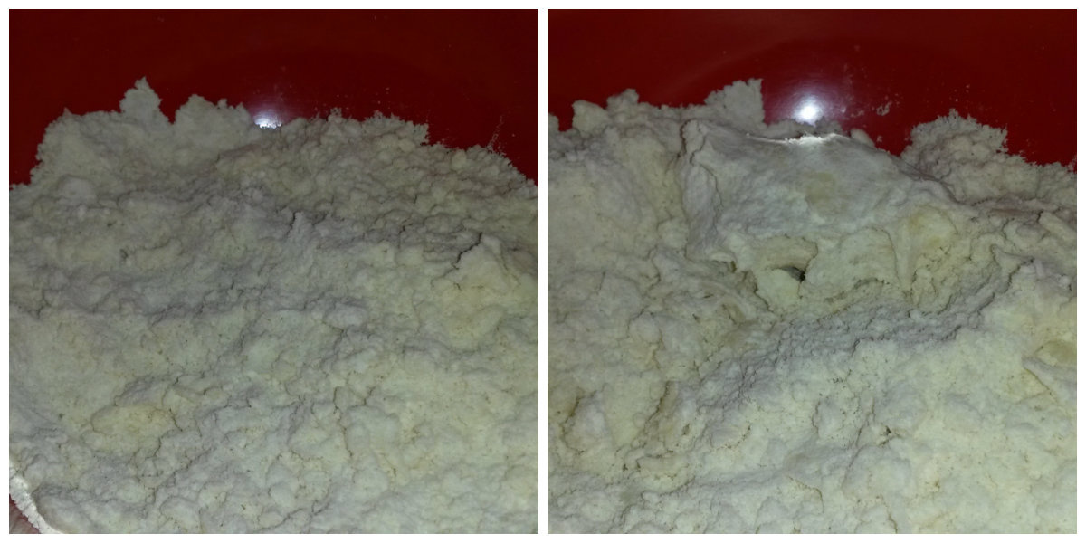 Incorporate a glorious stick of butter into the flour mixture. I use my fingers for this, but forks, knives, pastry cutters, and food processors are also options if you want to go the civilized route. Once all the butter is added, the mixture should be crumbly–but it should also have enough moisture from the butter that the mixture clumps together if you squeeze it, like in the image on the right.