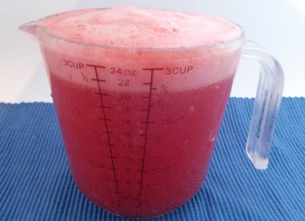 I love how frothy it looks at the top. Like beer, except not gross. Of course, we’re looking for three cups of juice, not 2 2/3 cups of juice and some froth, so after this I scooped up the froth and blended some more watermelon to top it off. But let’s just admire the pretty froth, shall we?