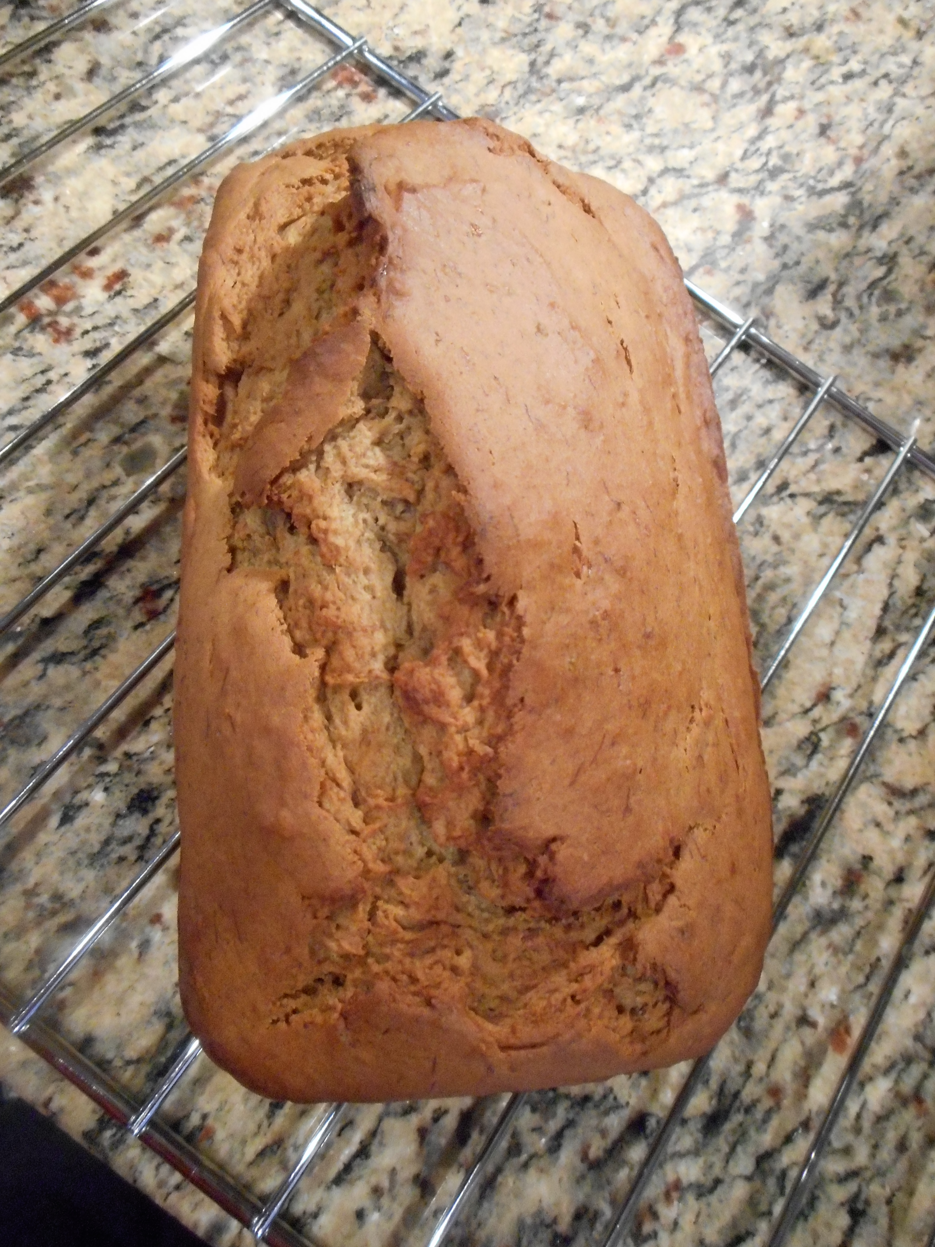 I’m slowly building my pantry back up, but when I made this banana bread, I had to go with a recipe that involved ingredients I did have. I took a chance on another healthy recipe, this banana bread from Cooking Light, and it worked out quite well. It’s not as low-fat as Joy’s recipe–it’s got half a stick of butter and two eggs, yolks and all–but I like that it’s on the lighter side.