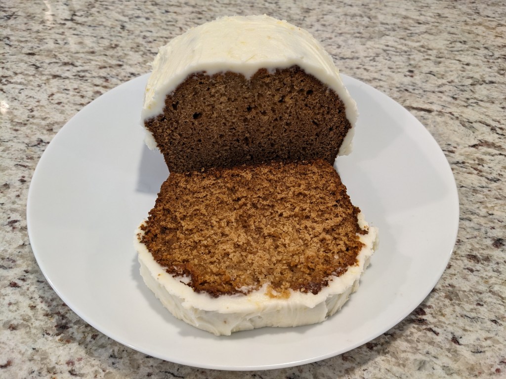 Pour cake mixture into prepared pan. Bake for 60 to 75 minutes or until it’s browned on top and a toothpick comes out with little to no crumbs. (I baked mine in a loaf pan for 65 minutes and accidentally left it in the pan for 15 minutes after taking it out of the oven and it came out dry. Don’t be me.) Leave in pan for five minutes, then turn onto a wire rack to cool. When cooled, top with lemon icing (if you like).